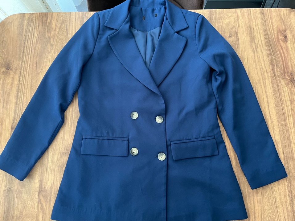 Mavi kadın blazer, düğmeli ön, kesik yaka ve uzun kollu. Normal kesim ve midi boyda, düz sentetik kumaştan, ofis kullanımı için uygun.
