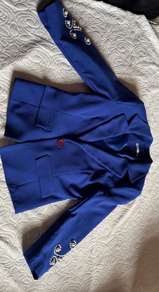 Parlak mavi renkte, düğmeli, kesik yaka ve uzun kollu kadın blazer ceket. Normal boyda, rahat kesim ve ofis için uygun.