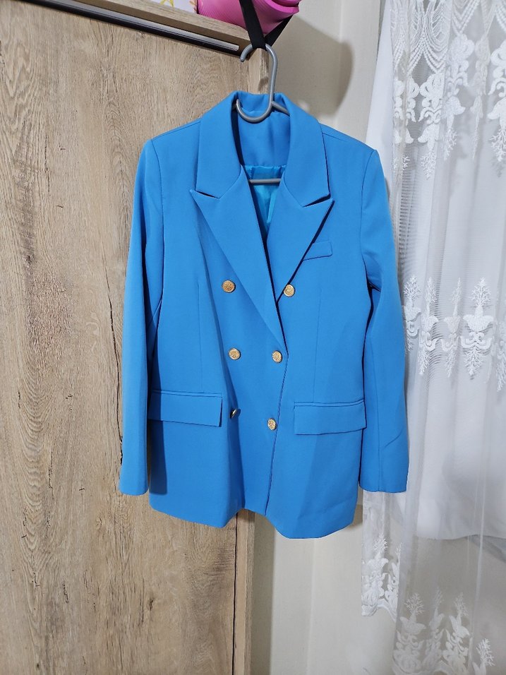 Açık mavi, düğmeli, uzun kollu, normal kesim kadın blazer ceket. Ofis için uygundur.