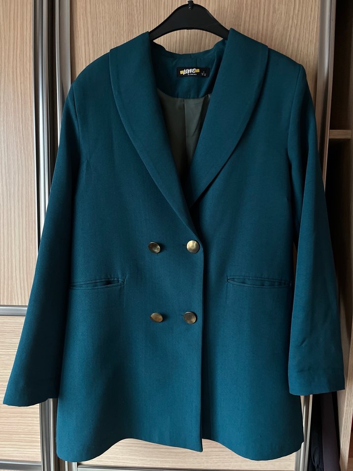 Mavi kadın blazer ceket, düğmeli ve kesimli yaka detayına sahiptir. Uzun kollu, normal boyda ve düz desensiz, modern klasik tarzda ofis kullanımı için uygundur.