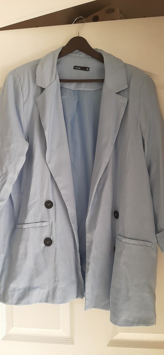 açik mavi renkli, viskon polyester kumaştan yapılmış düğmeli, normal boy midi uzunluğunda, regular kadın blazer. Ofis için uygun, notched yaka ve uzun kollu.