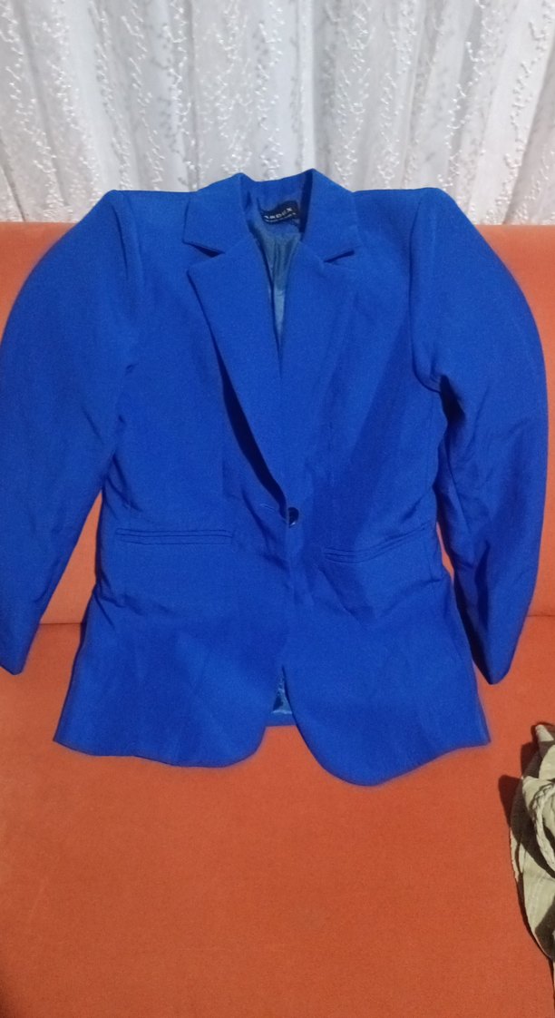 Düğmeli, mavi kadın blazer ceket, kesik yaka ve uzun kolludur. Normal kesim ve midi boyda, ofis kullanımı için uygundur.