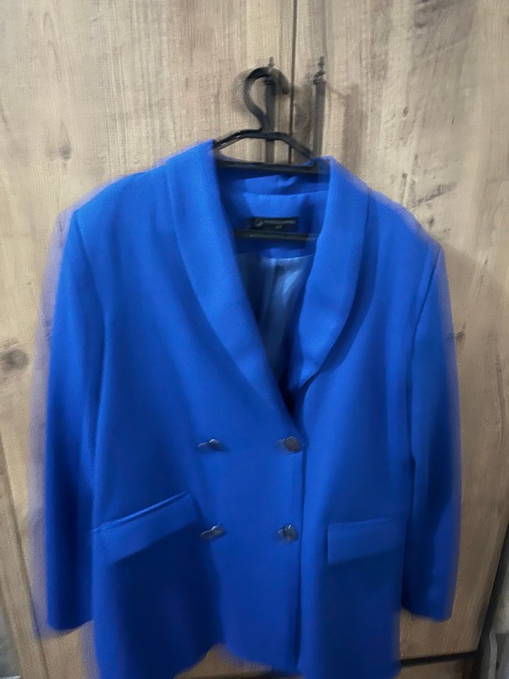 Mavi renkli kadın blazer ceket, düğmeli ve kesimli yaka detayına sahiptir. Uzun kollu, normal boyda ve parlak, ipeksi kumaştan üretilmiştir.