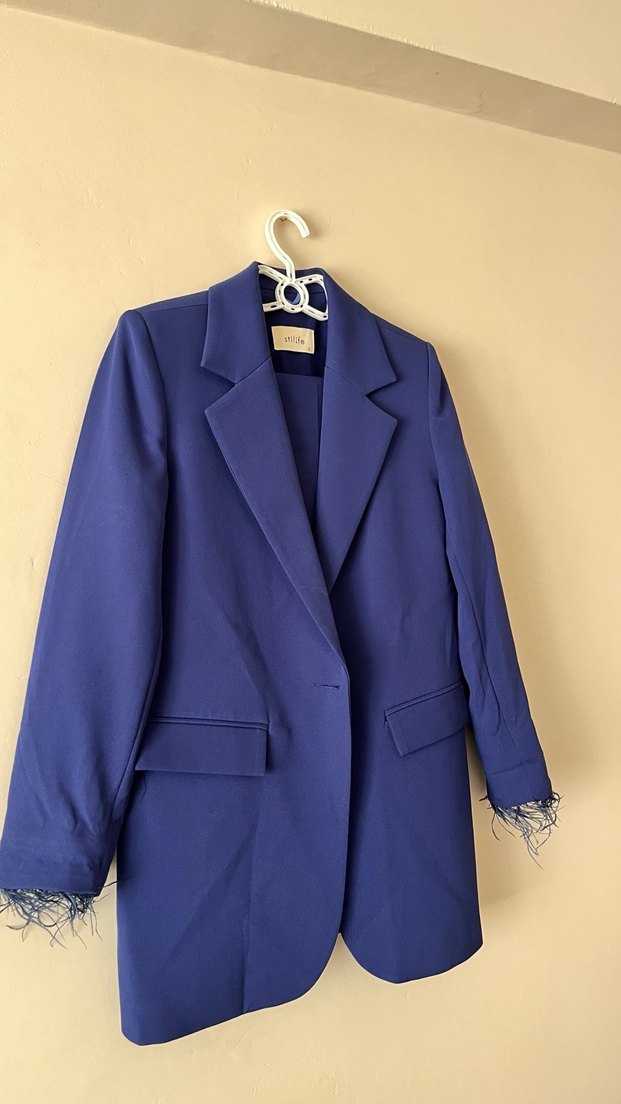 Düğmeli, parlak mavi saten kumaştan yapılmış, klasik yaka ve normal kesim kadın blazer takım ceket. Ofis için uygun, tüylü kol detaylı.
