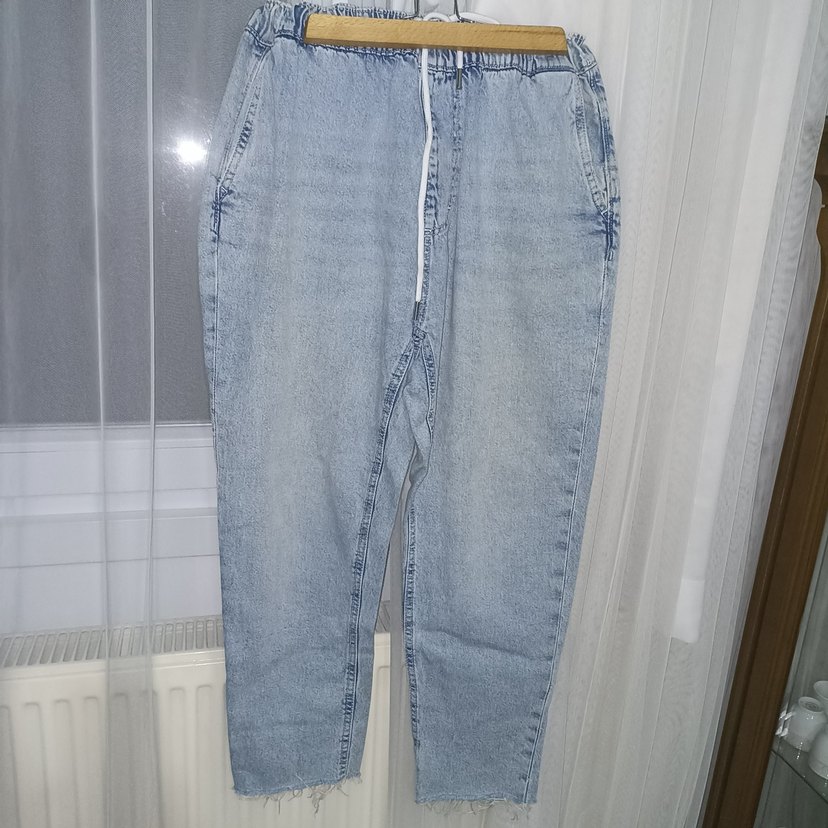 Düğmeli, bol kesim, pastel mavi renkte kadın denim pantolon. Günlük kullanıma uygun, normal boyda rahat bir modeldir.