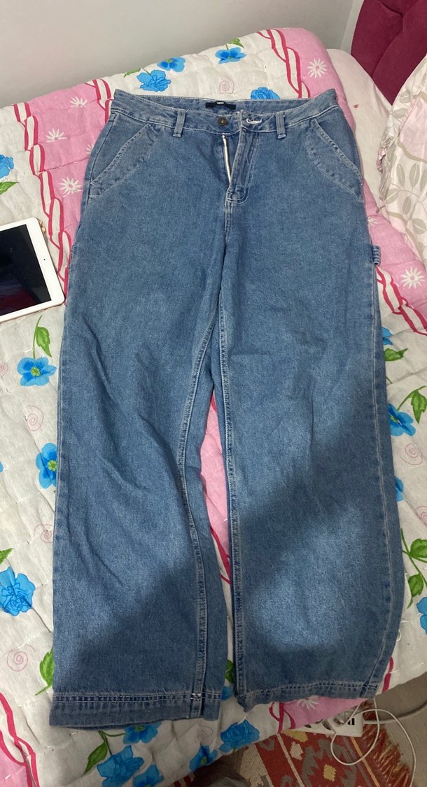 Düğmeli ön kısmı olan, bol kesim ve midi boy mavi pastel kot pantolon. Günlük sokak stili için uygun.