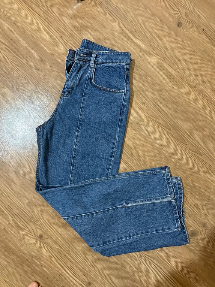 Düğmeli, bol kesim, mavi denim kadın kot pantolon. Midi boyda ve gündelik sokak stili için uygun.