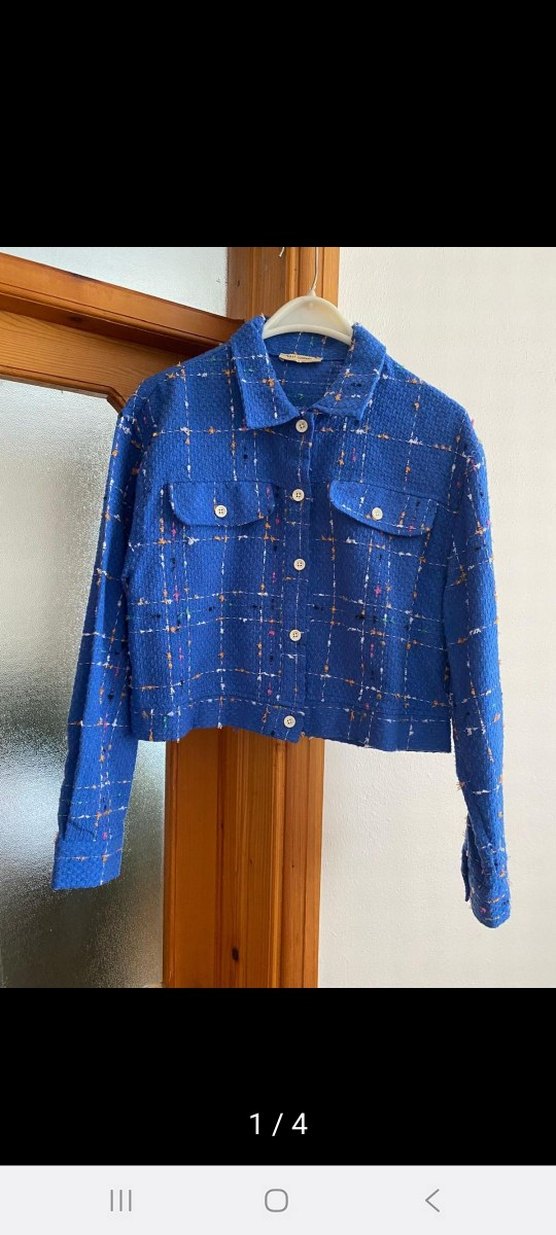 Düğmeli, mavi renkte kadın ceketi, notched lapel yakaya ve uzun kollara sahiptir. Düzenli kesimi ve parlak dokusu günlük kullanıma uygundur.
