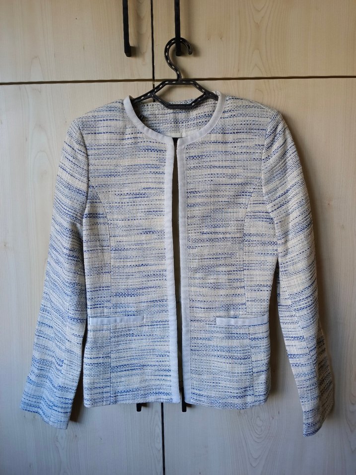 Düğmeli, uzun kollu mavi kadın ceket. Keten kumaştan, normal kesim ve midi boyda, ofis kullanımı için uygundur.
