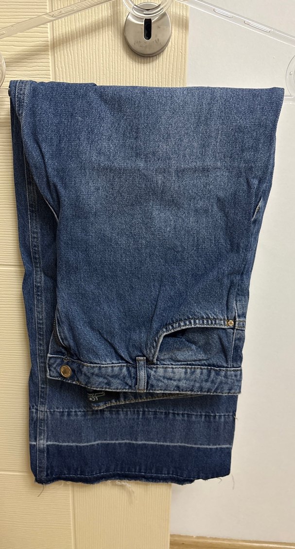 Düğmeli, bol kesim, mavi denim kadın pantolon. Midi boyda ve parlak görünümlü, günlük rahat stil için uygun.