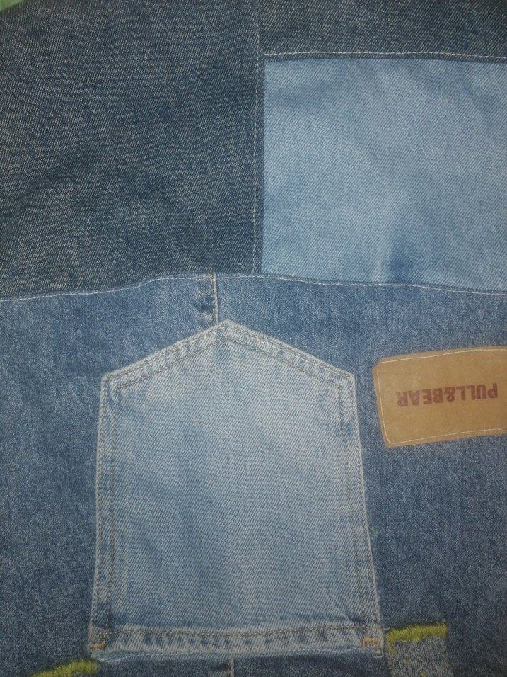 Düğmeli ön kısmı ve patchwork detayları olan parlak mavi denim, rahat kesim midi uzunlukta kadın çanta . Sokak stiline uygun. el yapımı, tasarım ürün.