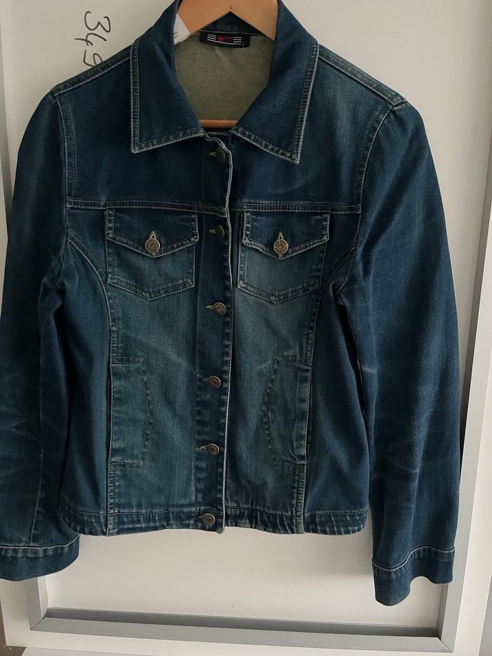 Düğmeli ve yaka detaylı, parlak mavi renkte, uzun kollu, normal boyda, kadınlara özel, sokak stiline uygun denim ceket.