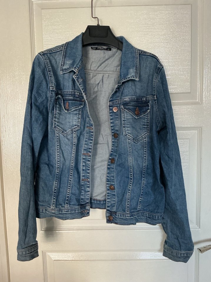 Düğmeli, uzun kollu, yaka detaylı ve vücuda oturan mavi denim ceket. Günlük kullanıma uygun, rahat bir sokak stili sunar.