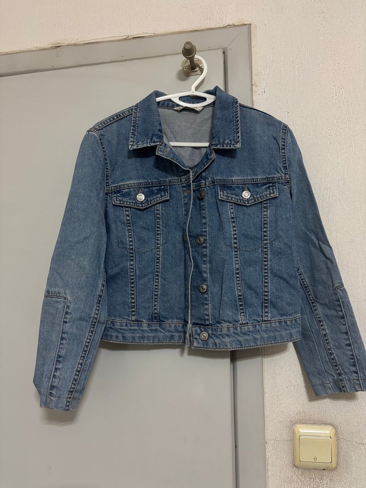 Düğmeli, uzun kollu, notched lapel yakalı, fitted kesim mavi kadın denim ceket. İki göğüs cebi ve normal uzunlukta, günlük kullanıma uygun.