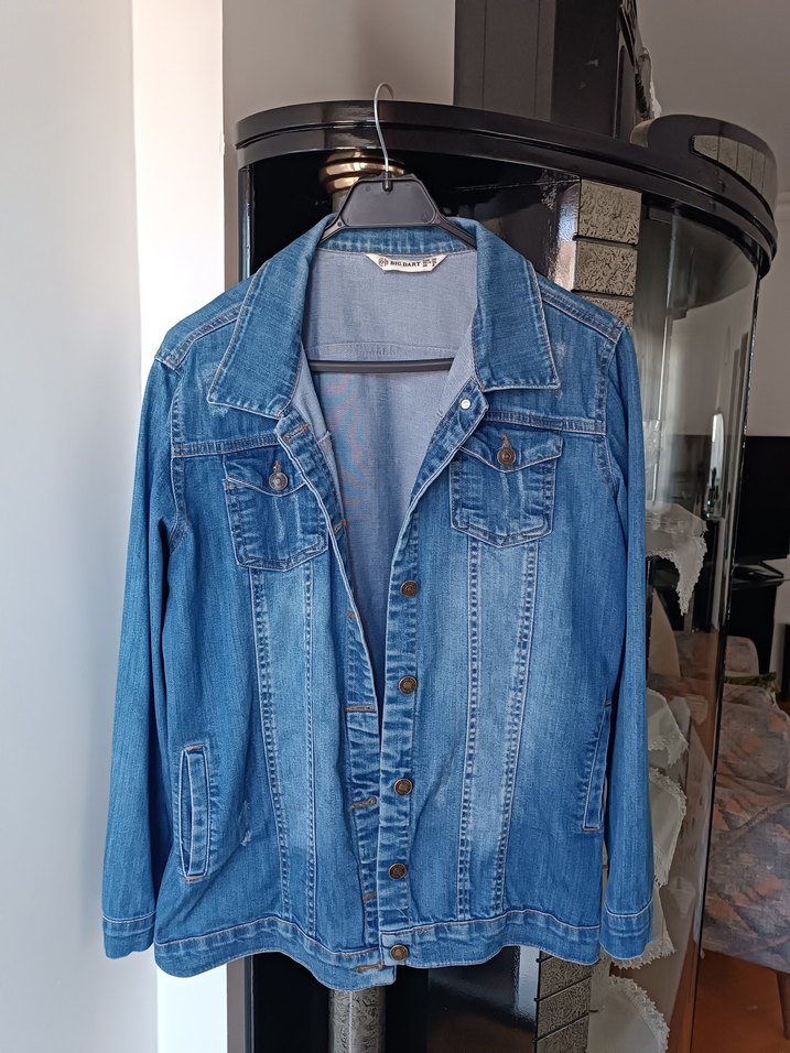 Düğmeli ön kısmı ve kesimli yaka detayıyla mavi denim ceket. Bol kesim, uzun kollu ve normal boyda, günlük rahat sokak stili için uygundur.
