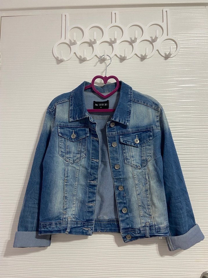 Düğmeli, mavi renkli, fitted kesim kadın denim ceket. Notch yakalı, uzun kollu, günlük sokak stili için uygundur.