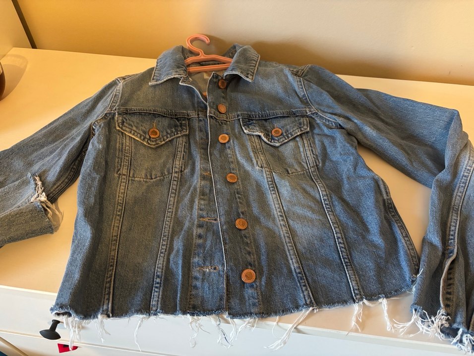 Mavi kadın denim ceket, düğmeli ön kısmı ve kesik yaka detayıyla rahat bir kesime sahiptir. Uzun kollu, normal boyda ve parlak kumaftan üretilmiştir. İki düğmeli göğüs cebi bulunur. Colins marka m beden kot ceket