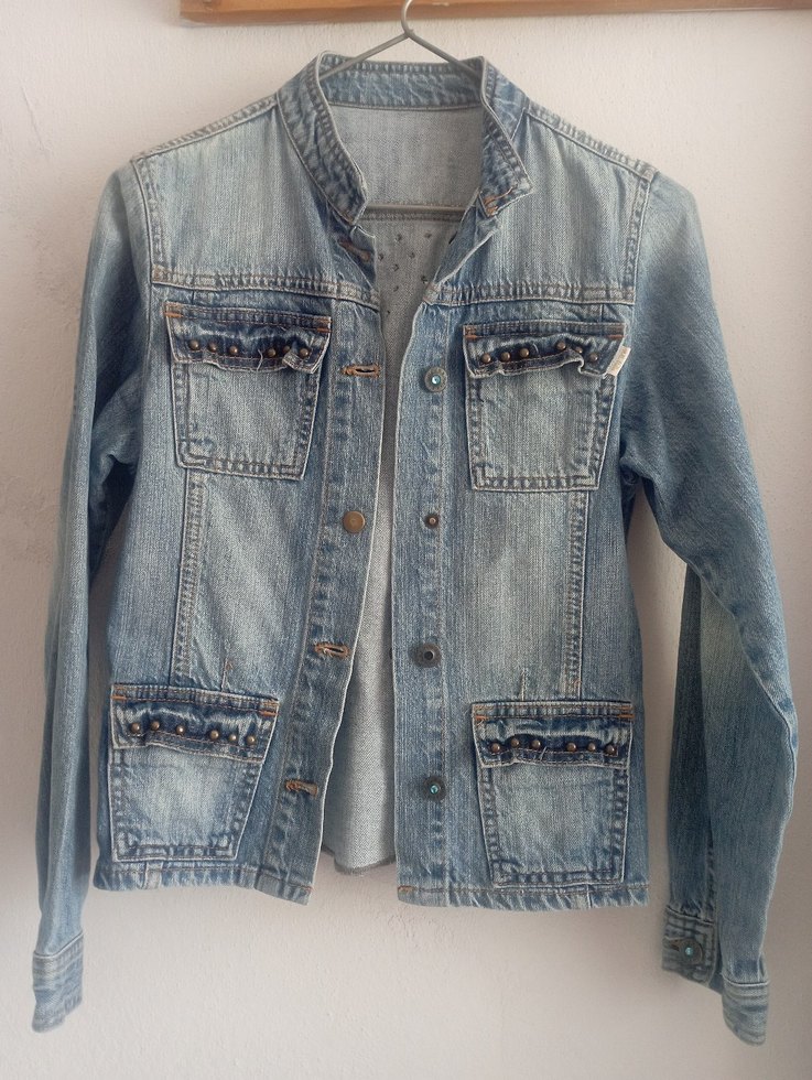 Düğmeli, cepli mavi denim ceket, normal boy, regular fit, uzun kollu, günlük sokak stili için uygun.