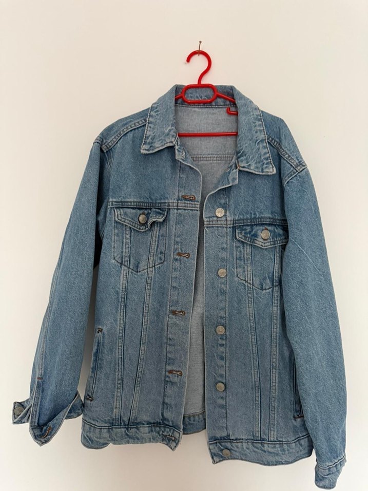 Düğmeli, notched lapel yakalı, uzun kollu mavi denim ceket. Gevşek kesimi ve midi boyu ile rahat bir günlük stil sunar. Hiç kullanılmadı.
