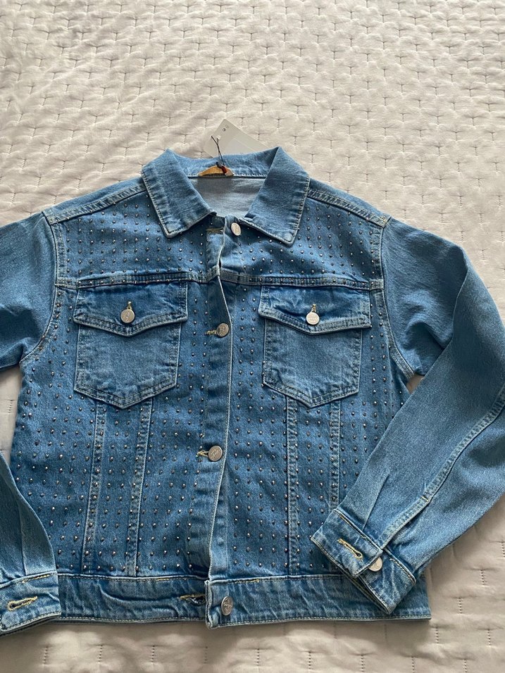 Düğmeli, uzun kollu, bol kesim mavi denim ceket. Notlu yakalı ve parlak görünümlü, günlük rahat kullanıma uygun.