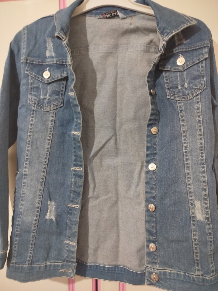 Mavi denim ceket, düğmeli ve normal midi boyda. Uzun kollu, düz kesim ve yaka detayıyla günlük sokak stiline uygundur. Hafif yıpranmış görünümü vardır.