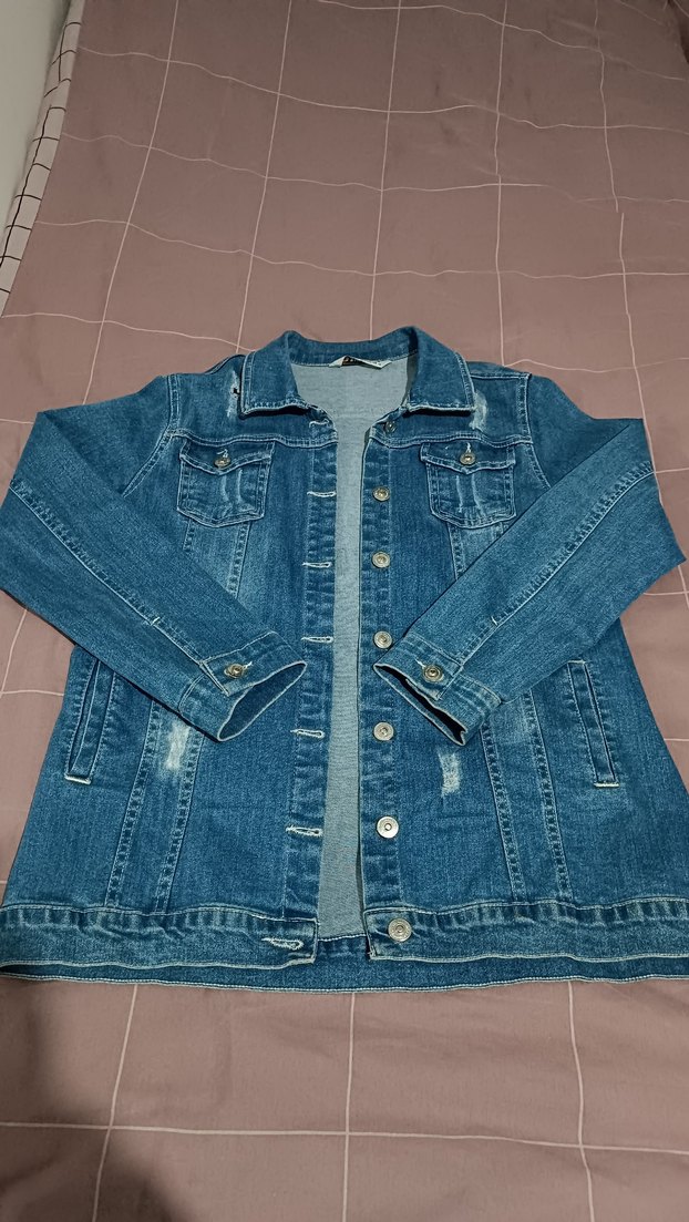 Düğmeli ön, kesik yaka ve uzun kollu bu kadın denim ceket, bol kesim ve normal midi boyda. Parlak mavi renkte, günlük rahat sokak stili için uygun. M/L uyumlu