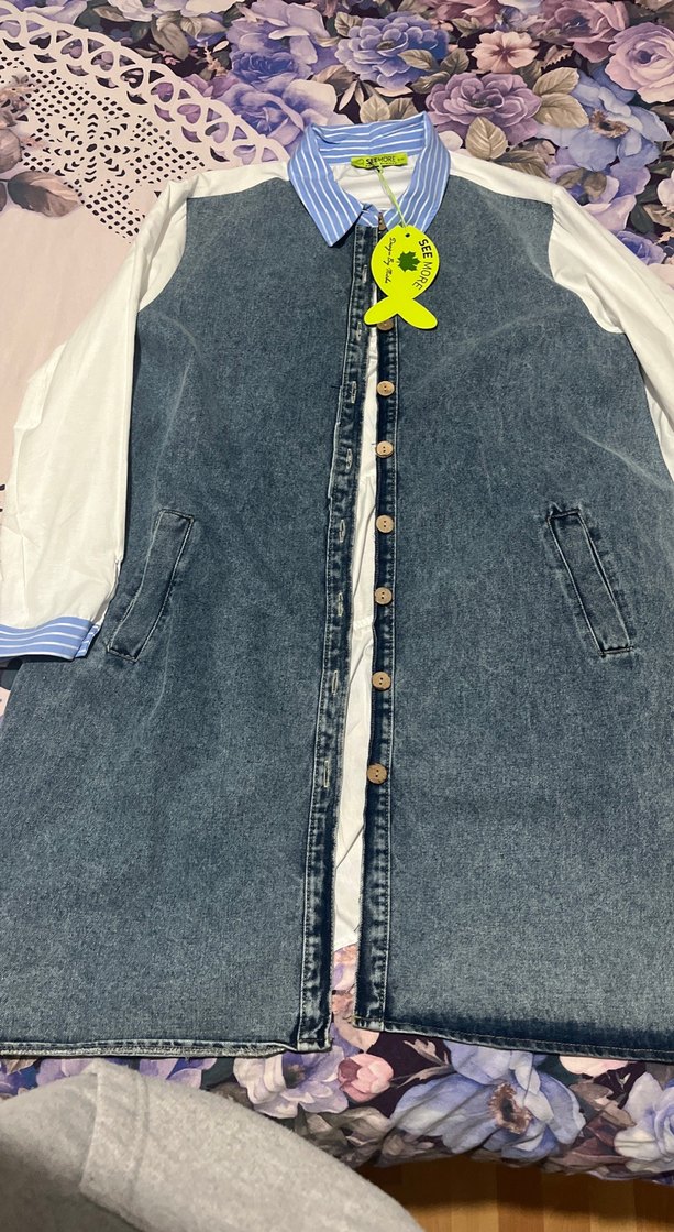 Kadınlar için düğmeli, uzun kollu, kesik yaka detaylı mavi-gri tonlarında batik desenli denim ceket. Normal boy ve rahat kesim, günlük sokak stiline uygun. 44 46 bedene uyumlu