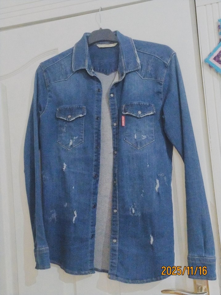 Düğmeli, uzun kollu, notlu yakalı kadın denim ceket. Rahat kesim, mavi-gri tonlarında, gündelik sokak stiline uygun. Ön cepleri ve hafif yıpranma detayları bulunur.