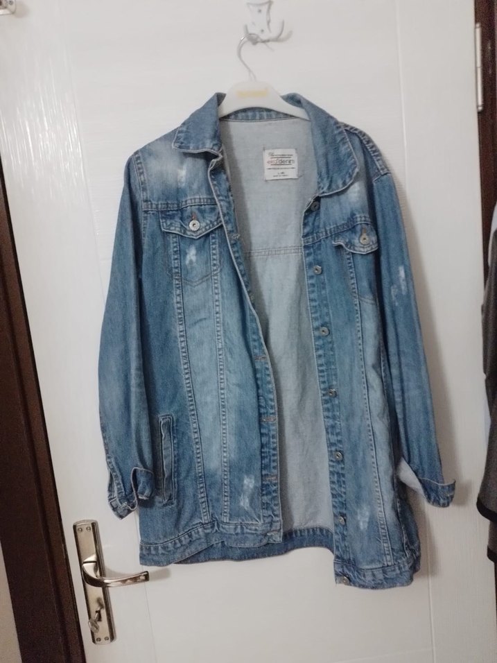 Düğmeli önü ve uzun kollu, notched yakalı, bol kesim mavi denim kadın ceket. Günlük kullanıma uygun midi boyda, sokak stilinde rahat bir parça.