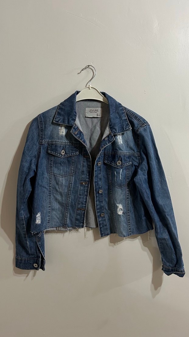 Mavi renkli, düğmeli, uzun kollu ve yaka detaylı bol kesim denim ceket. Hafif yıpranmış görünümüyle rahat sokak stili için uygundur. Ürün uzunluğu: 45-46 cm