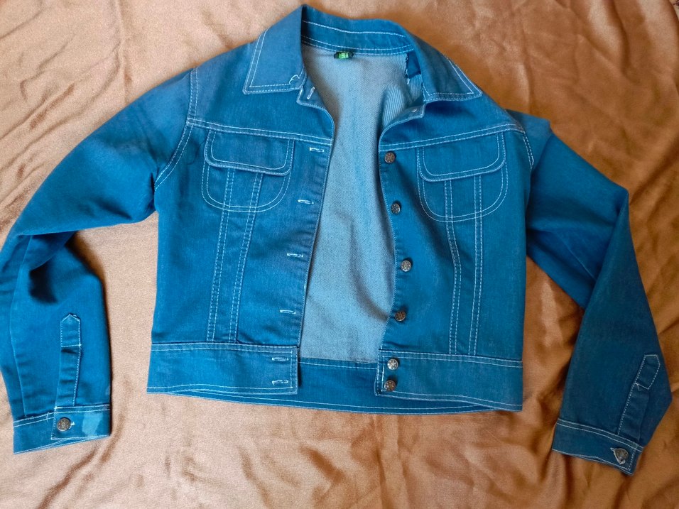 Düğmeli ve çıtçıtlı, parlak mavi renkte kadın denim ceket. Normal boyda, uzun kollu, salaş kesim ve desen içermeyen günlük rahat stil için uygundur. Sadece kolunda leke var.
