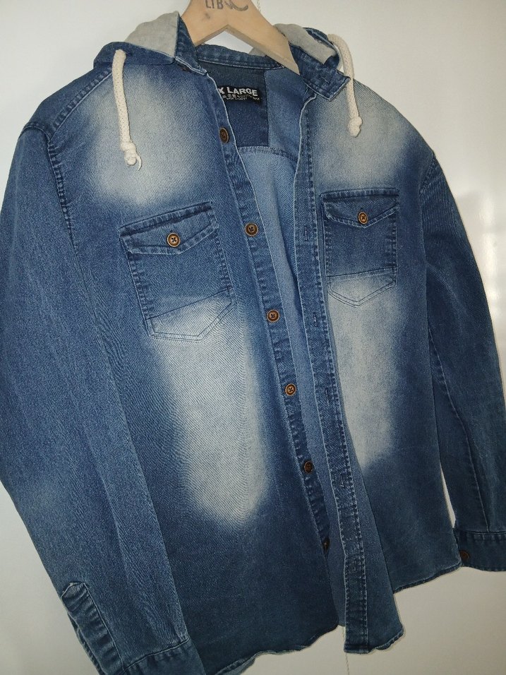 Düğmeli ön kapama, uzun kollu ve bol kesimli mavi denim ceket. Notlu yaka ve kapüşonlu, günlük kullanıma uygun rahat bir sokak stili ceket.