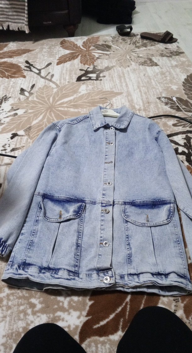 Düğmeli, uzun kollu, bol kesim mavi denim ceket. Notlu yaka ve iki ön cepli, günlük rahat stil için uygun.