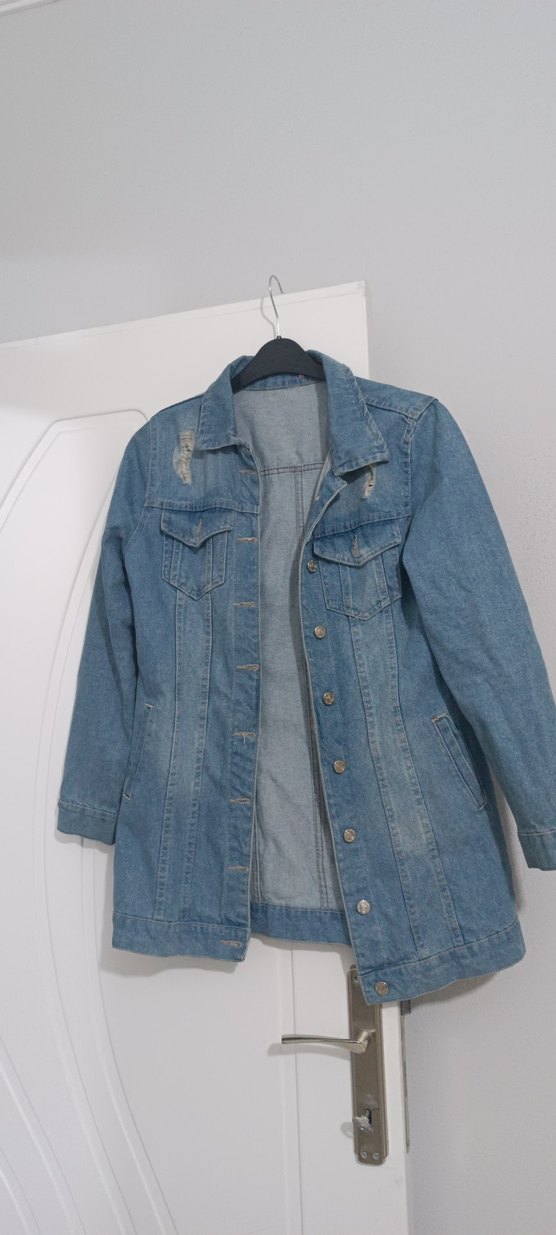 Mavi denim kumaştan, düğmeli, uzun kollu ve notalı yaka detaylı, salaş kesim midi uzunluğunda kadın ceket. Rahat ve günlük kullanıma uygundur.