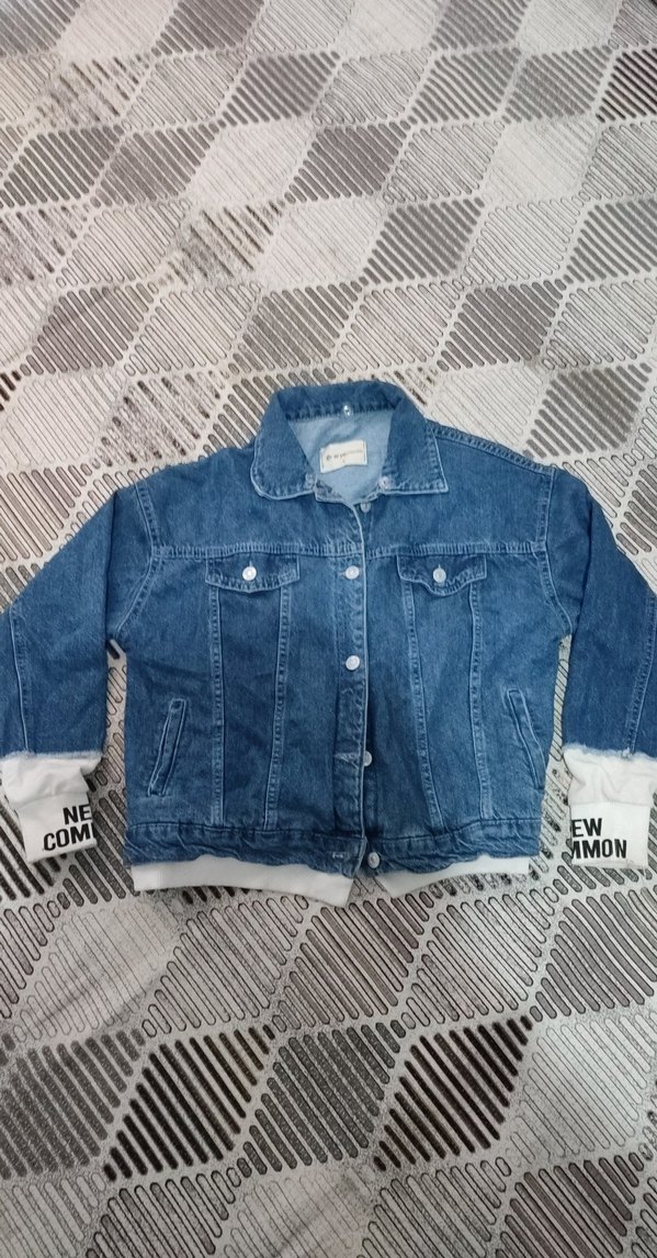 Mavi denim kumaştan, düğmeli, uzun kollu ve bol kesim kadın ceket. Gri notched lapel yakaya ve yazılı beyaz manşetlere sahiptir. Günlük kullanım için uygundur.
