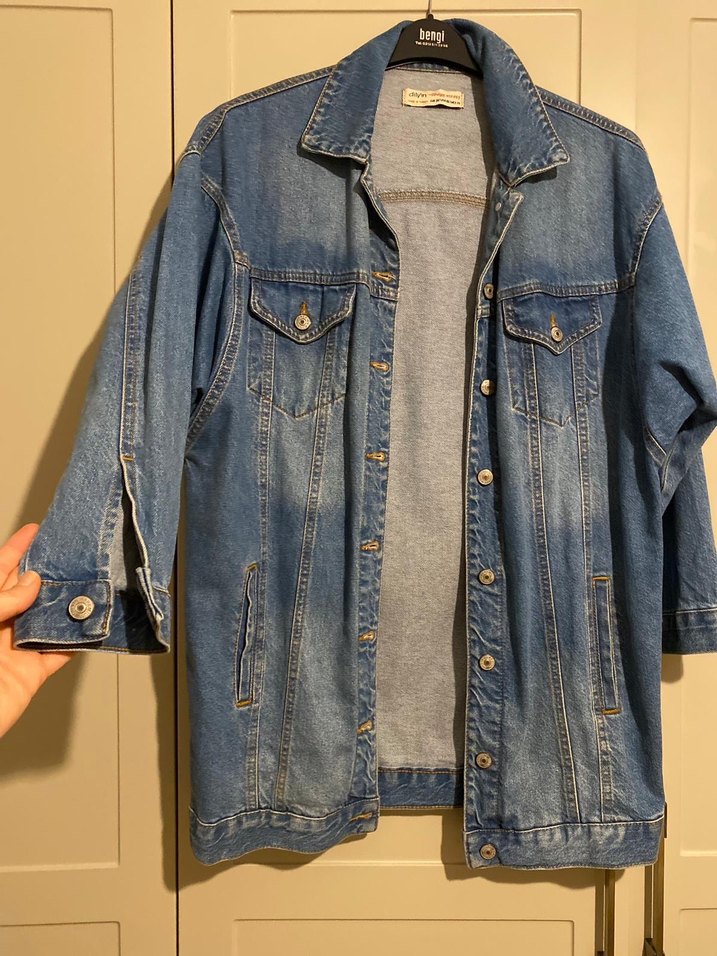 Düğmeli, notalı yaka ve bol kesimli bu kadın denim ceket, uzun kollu ve midi boydadır. Mavi ve gri tonlarında, günlük sokak stiline uygundur.