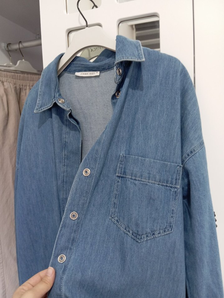 Düğmeli, yakalı, uzun kollu ve bol kesim mavi denim ceket. Günlük kullanım için tek cep detaylı rahat bir sokak stili sunar.