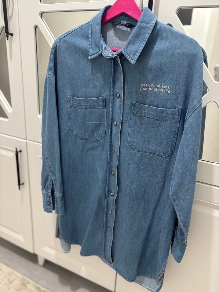 Bol kesim, uzun kollu, düğmeli mavi denim ceket. İki ön cep ve baskılı yazı detayıyla günlük sokak stili için ideal, midi boyda.