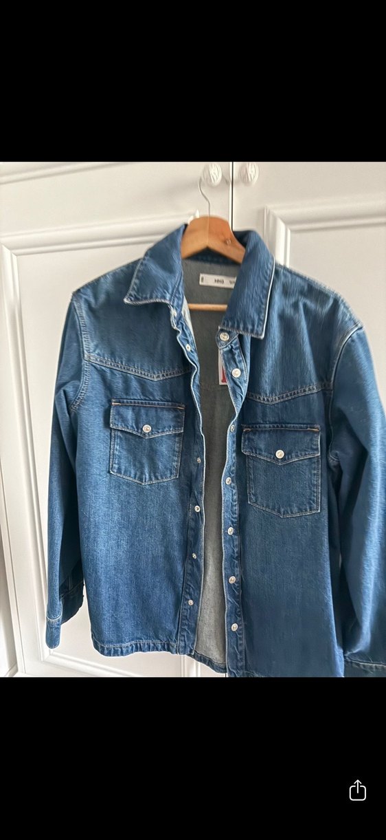 Düğmeli, normal uzunlukta, mavi renkli kadın denim ceket. Notlu yaka ve uzun kollu, rahat kesimiyle günlük sokak stiline uygundur.