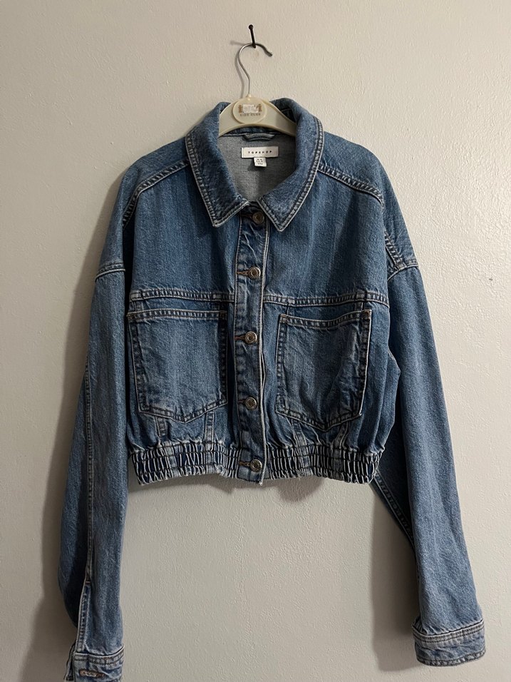 Düğmeli, bol kesim ve yakalı mavi denim ceket. Uzun kollu ve midi boyda, rahat sokak stili için uygundur.