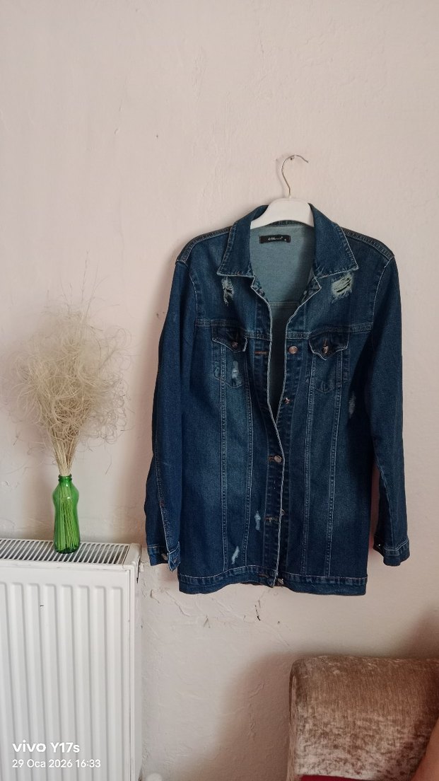 Düğmeli, uzun kollu, notched lapel yaka detaylı mavi denim ceket. Gevşek kesim, midi boy ve parlak renk tonuyla günlük rahat sokak stili için uygun.