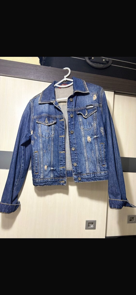 Düğmeli, uzun kollu, mavi denim ceket. Normal kesim, notched lapel yaka ve gündelik kullanıma uygun rahat tarzda.