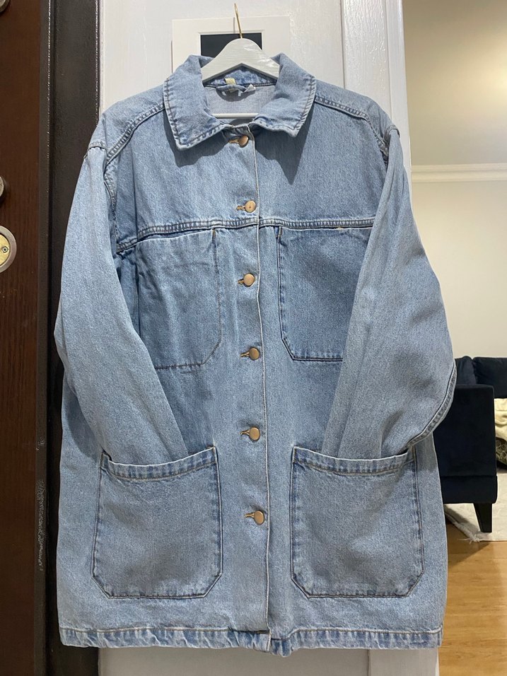 Pastel mavi renkte, düğmeli, uzun kollu, bol kesim kadın denim ceket. Notlu yaka ve büyük ön ceplerle günlük rahat stil için uygundur.