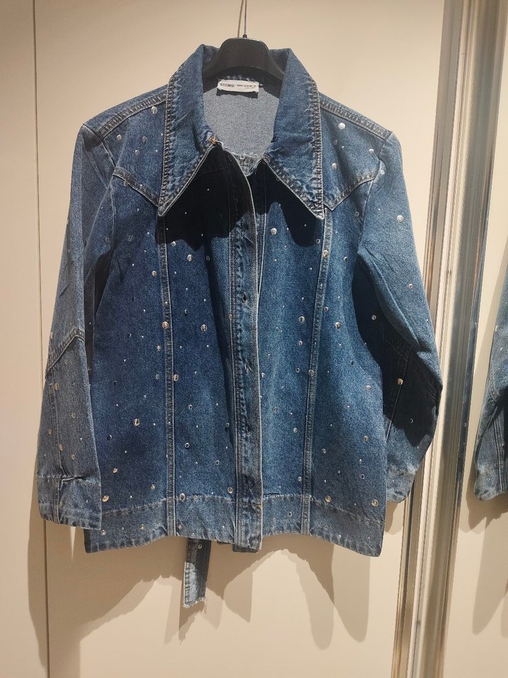 Düğmeli, parlak mavi renkte, normal boy ve bol kesim kadın denim ceket. Notlu yaka ve uzun kolludur, günlük rahat stil için uygundur.