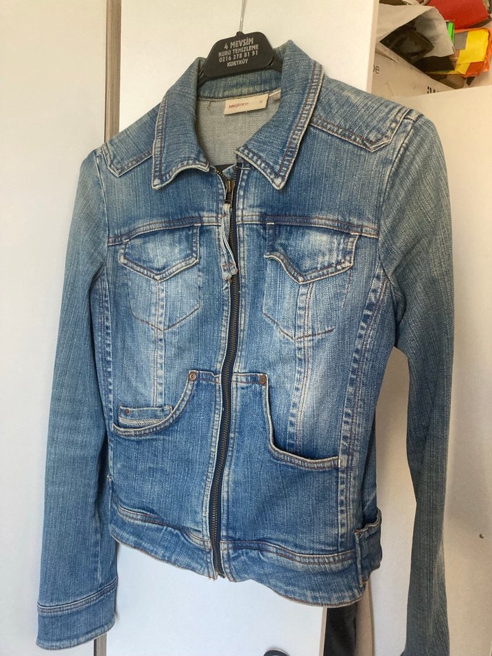 Düğmeli, normal boy, uzun kollu mavi denim ceket, kesimli ve yakası notched lapel. Günlük kullanıma uygun rahat stil sunar.