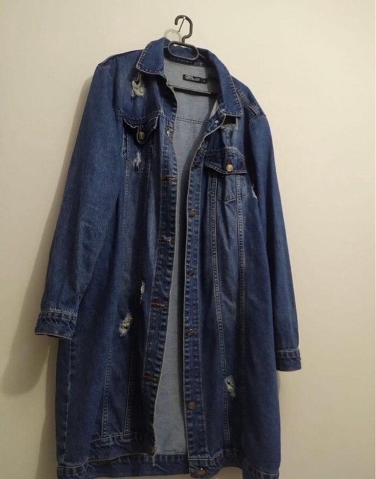 Mavi renkli, düğmeli, uzun kollu ve notched yakalı, bol kesim kadın denim ceket. Midi boyda, günlük rahat stil için uygun. Bazı yırtık detayları vardır.