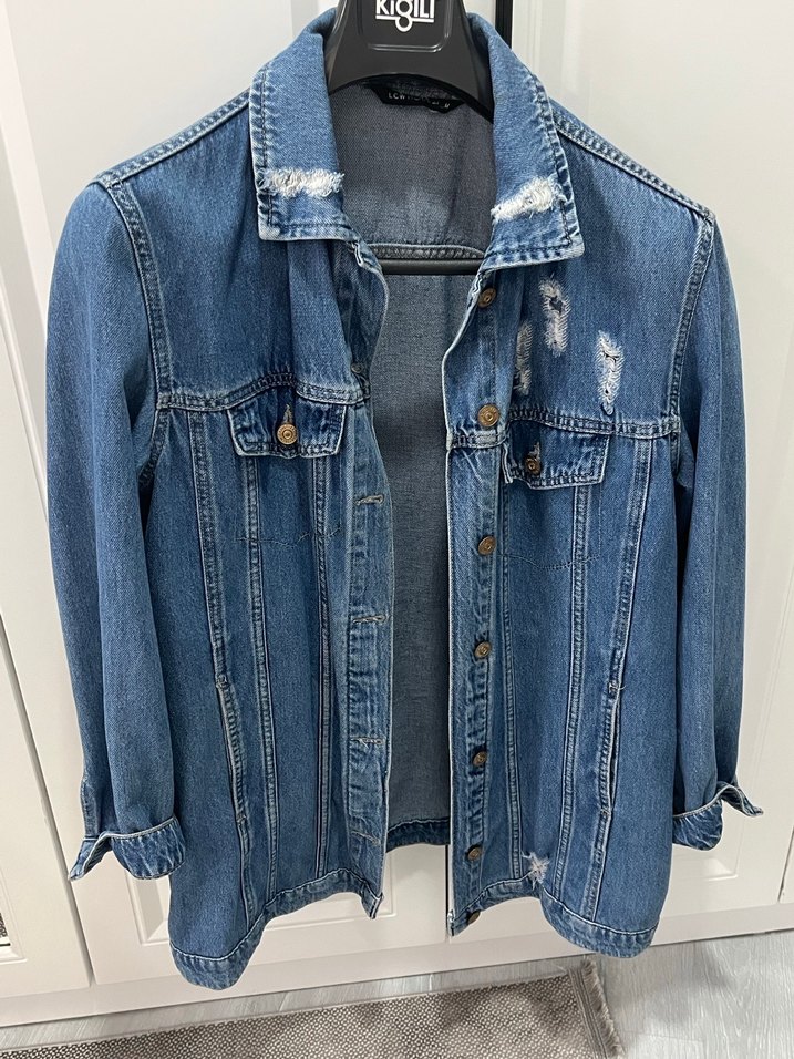 Düğmeli, uzun kollu, bol kesim mavi denim ceket. Notlu yaka ve hafif yıpranmış detaylara sahip, günlük rahat kullanım için uygun.