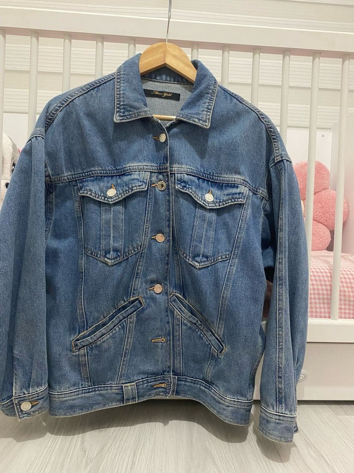 Düğmeli, parlak mavi renkte, notched yakalı, bol kesim ve askılı kollu kadın denim cekettir. Normal midi boyda, desen içermeyen günlük kullanıma uygundur.