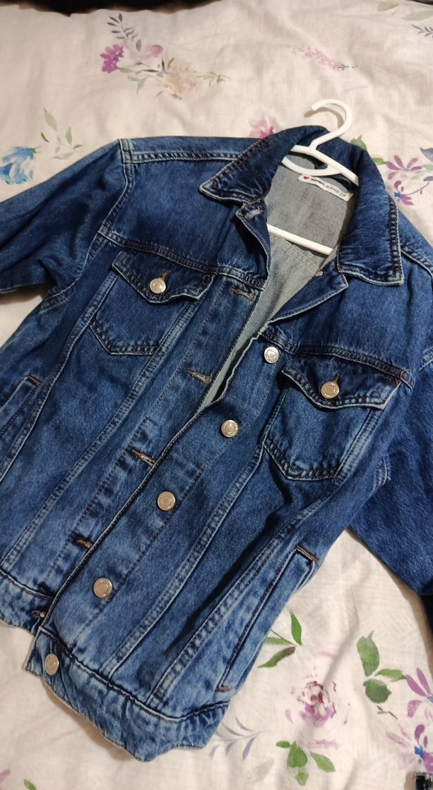 Mavi denim kumaştan yapılmış, düğmeli ve uzun kollu, salaş kesim kadın ceket. Notlu yaka ve gündelik sokak stili için uygundur.