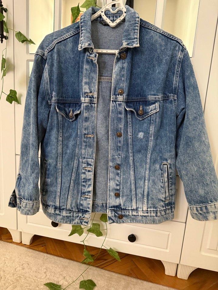 Mavi renkli, düğmeli, uzun kollu, bol kesim kadın denim ceket. Notched lapel yakası ve gündelik kullanıma uygun rahat tarz sunar.